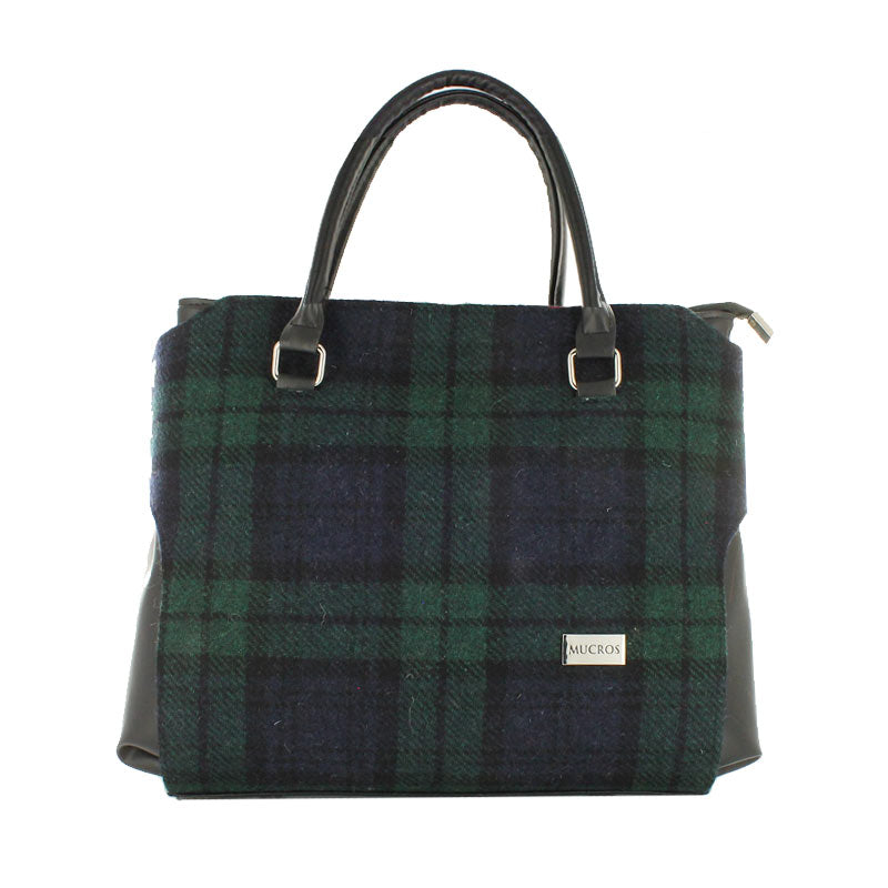 This is a beautiful tote style bag that can hold small tablets, your wallet, phones and so much more all while looking so chic. The Emily bag measures about 13" wide and 11" tall and 5" deep. It is a double handled bag plus an adjustable shoulder strap is included. Also has one exterior zip pocket. A spacoius interior has a zip pocket with 2 slide in pockets. This bag is made of black faux leather on the base, side and straps and wool tweed surround with a full zip on top to secure your belongings. Made in Ireland.