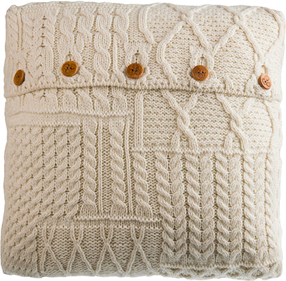 Beautiful Aran pillow cover with buttons.  Featuring traditional Aran stitch patterns, patchwork style, including diamond stitch, mirrored and regular rope cables, elongated cables, and honeycomb stitch. A perfect engagement, wedding, or housewarming gift idea, to be treasured for years. The Aran stitch patterns feature on both the front and back of the pillow cover. Knitted in premium 5 gauge 100% Merino in Ireland. Dimensions: 16in x 16in (41cm x 41cm).