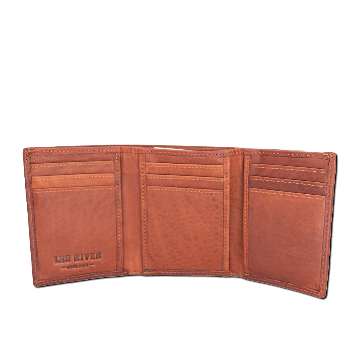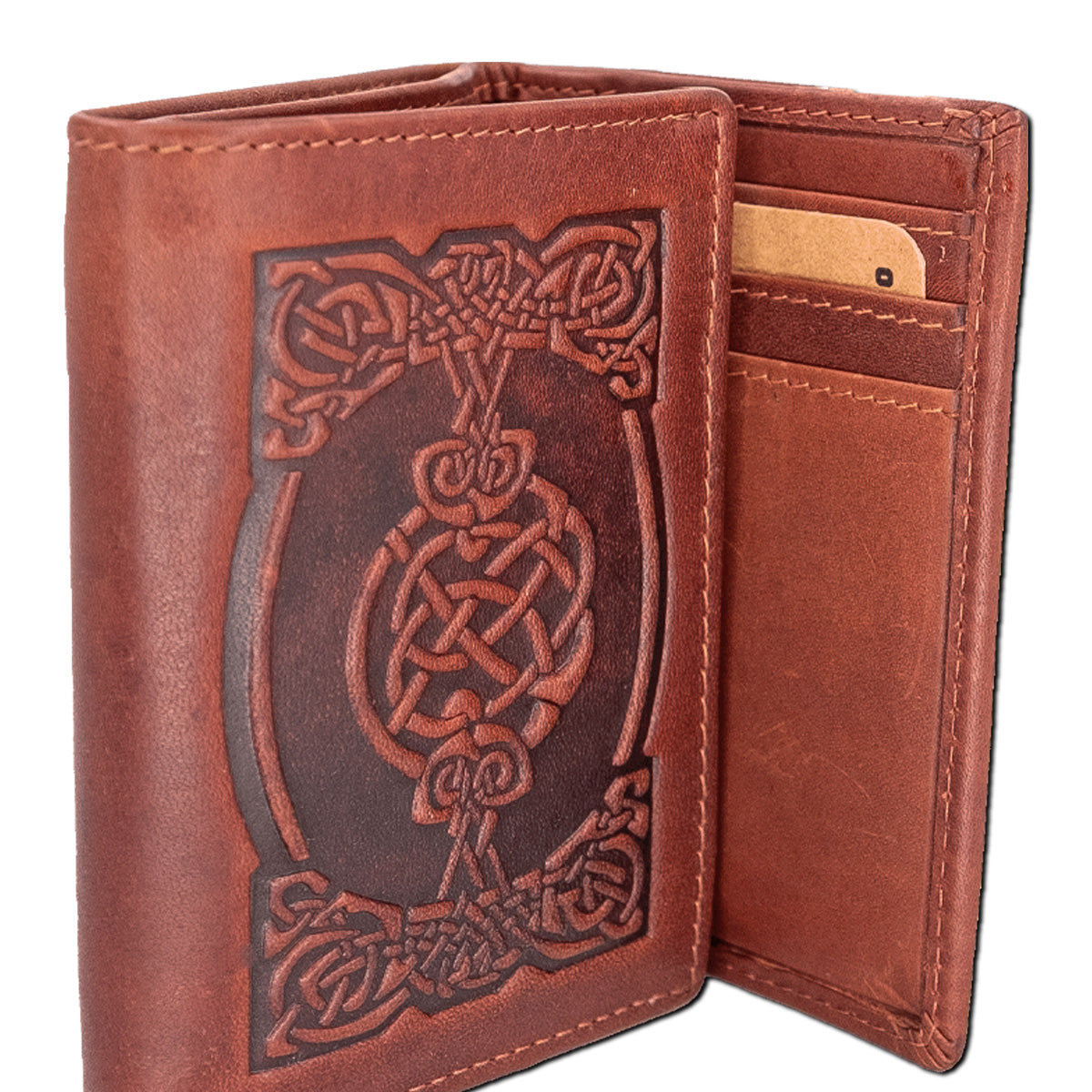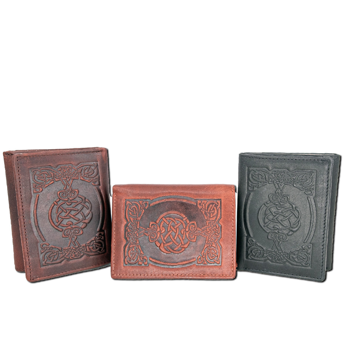 Celtic Tri-Fold Leather Wallet from Ireland. Experience authentic Irish craftsmanship with this veg-tanned real leather tri-fold Celtic wallet, designed for durability, style, and practicality. Made from premium full-grain leather, this wallet ages beautifully over time, developing a rich patina unique to its owner. Featuring intricate Celtic embossing, it blends tradition with modern functionality. The tri-fold design offers ample storage, including multiple card slots, and a spacious double bill compartment, ensuring your essentials stay organized. Own a timeless piece of Celtic heritage. Perfect for everyday use or as a meaningful Irish gift. Carry a piece of Ireland wherever you go!