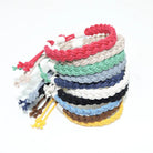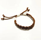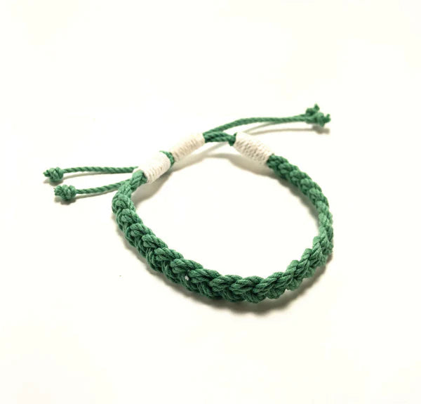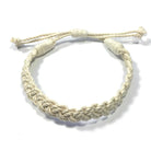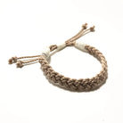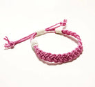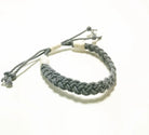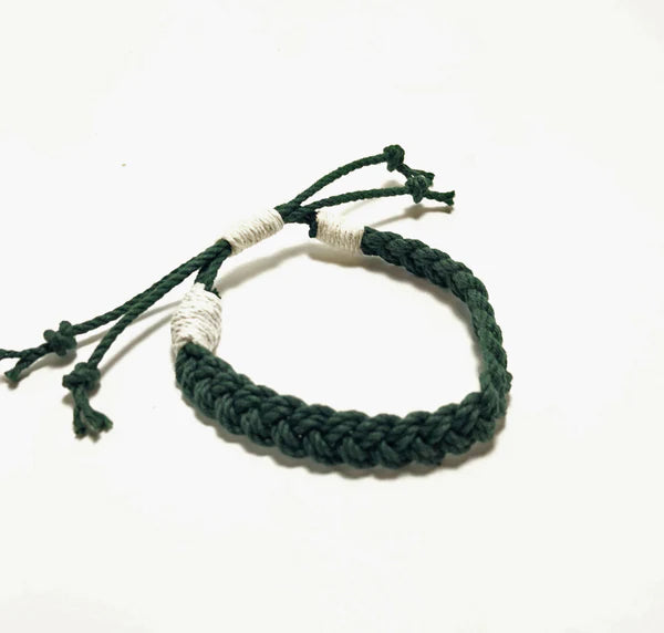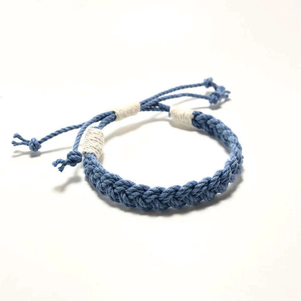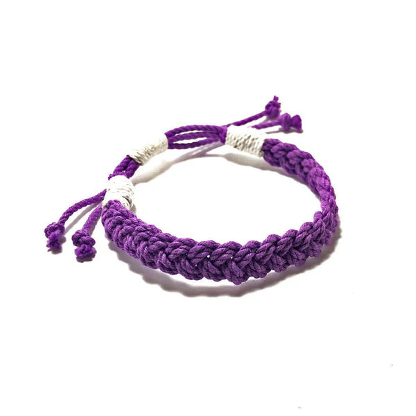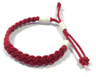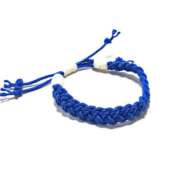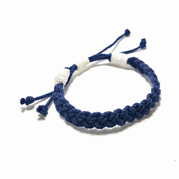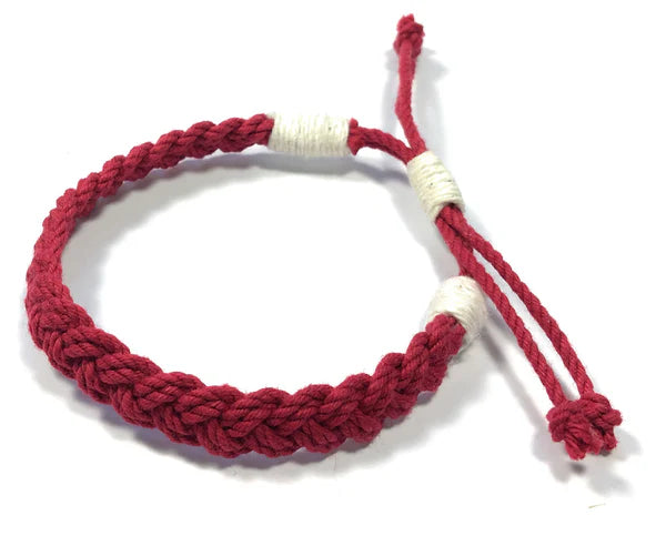 This is a woven knot style bracelet adjustable to fit your wrist. Fully closed it measures 6 inches, and it opens up to 10 inches to slip over your hand. It can be worn loose or snug. Made with cotton cord and measures 3/8" wide. To put on, just pull the bracelet to open. Once on, pull the cords to adjust to your wrist size. All cotton. Handcrafted in the United States.