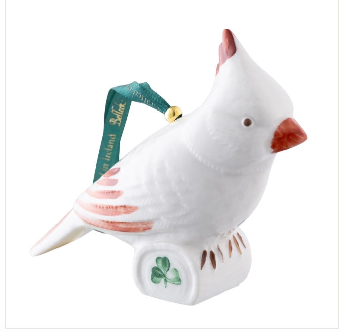 This is Belleek's beautiful Cardinal Ornament. The festive bright red cardinal is synonymous with Christmas particularly in North America. Because cardinals do not migrate, they can often be spotted in the winter months where their bright red plumage is very eye catching against a winter back drop. The Cardinal is a symbol of good tidings and joy as well as a symbol or remembrance. It is said that if you see a cardinal, it is a message that a loved one is thinking of you. Hand made in Ireland.