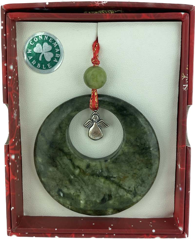 Crafted from authentic Connemara marble, this round ornament with charm blends natural Irish heritage with timeless elegance. Each piece showcases unique green marble only found in Connemara Ireland. The natural marble variations making every ornament distinct. Perfect for adding a refined Celtic touch to your holiday décor or gifting a meaningful keepsake rooted in tradition. The durable stone ensures lasting beauty season after season. Made in Ireland.