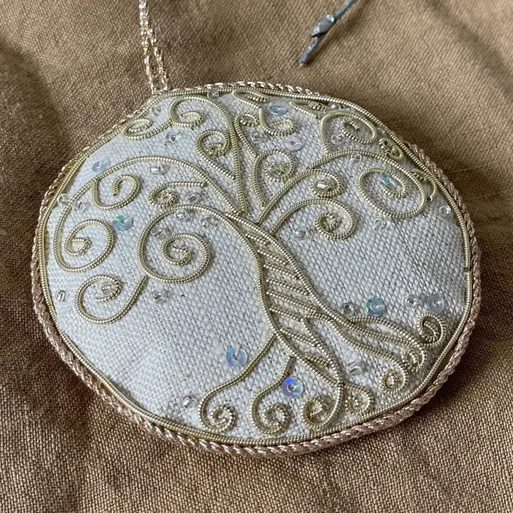 Handcrafted from vintage and local mill Irish linen, from one of the last remaining active linen mills in Ireland, This one showcases the Tree of Life, a timeless symbol of nature and balance. Perfect for collectors of Celtic art or anyone seeking meaningful, artisanal ornaments for their tree or as a gift. Handcrafted in Ireland.