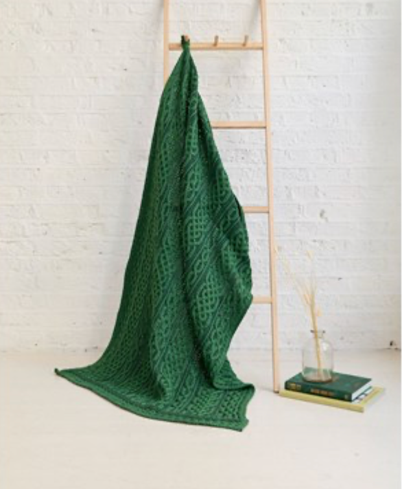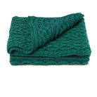 Stunning plaited Celtic throw. Showcasing classic Celtic trellis cable stitch designs. Beautifully edged with regular rope cables, single rib separates the various plaited Celtic trellis designs. The stitches are made to look more pronounced due to the plaited method of knitting; the base is knitted in one colour and the decorative stitches are knitted in a contrasting colour. A practical engagement, wedding, or housewarming gift idea to be treasured for years. 100% Merino in Ireland. Dimensions: 38" x 55" (97cm x 140cm). This beautiful color is a dark green with plaited kiwi green. Made in Ireland.