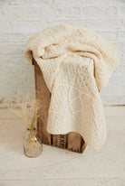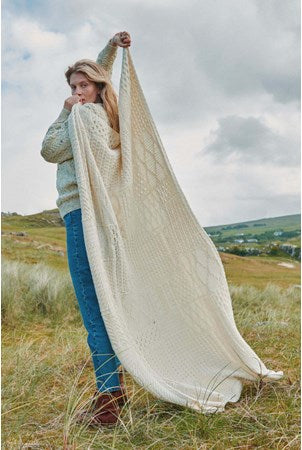 Celebrating traditional Aran stitch designs, this luxurious throw features different stitch patterns within each block. Diamond stitch, honeycomb stitch, and a variety of different cable stitches including elongated, mirror and regular rope cables feature in this highly textured throw. A practical engagement, wedding, or housewarming gift idea to be treasured for years. Knitted 100% Merino wool. Measurement: 40in x 60in. Made in Ireland