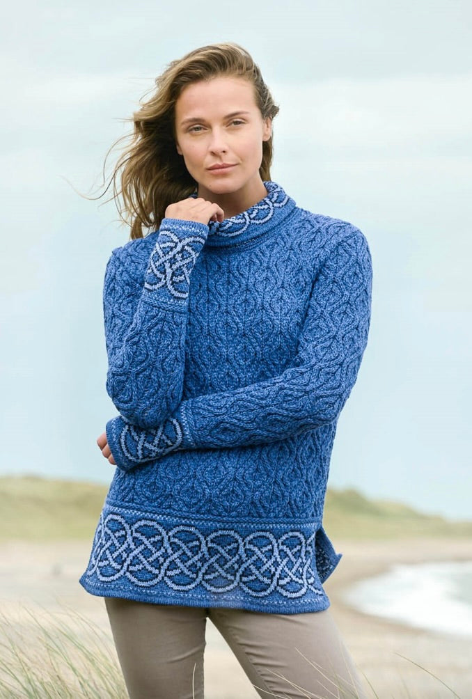 Ladies Celtic Knot Cowl Neck Aran Tunic Sweater Blue