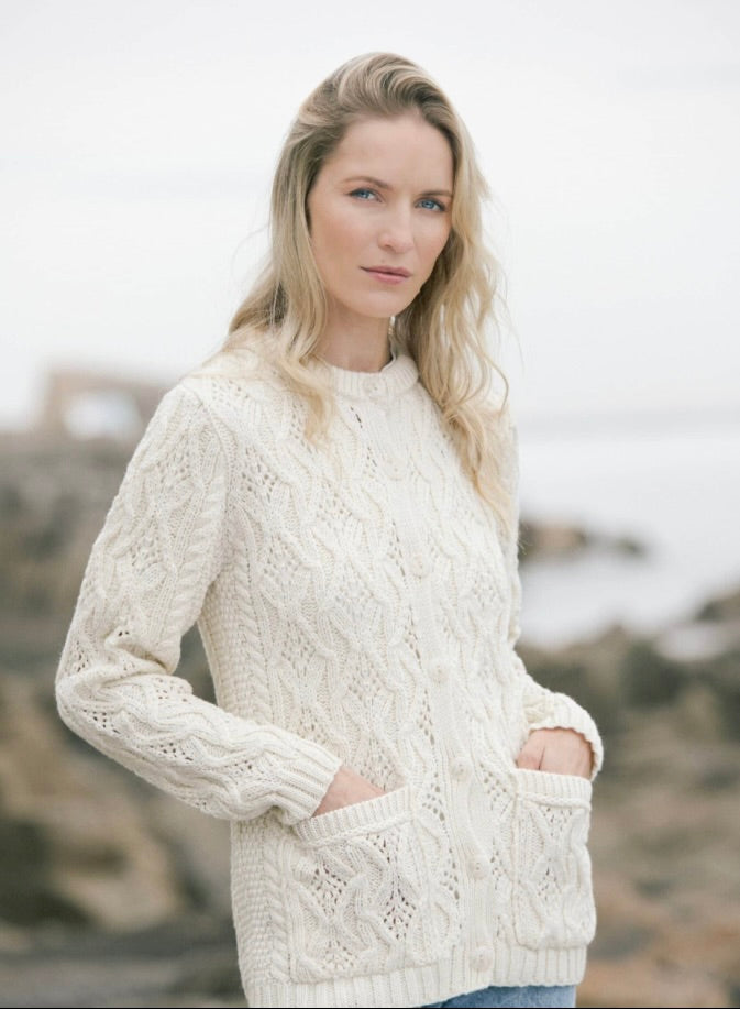Experience timeless comfort with our Ladies Super Soft Wool Cardigan, crafted from premium soft merino wool renowned for its natural softness and durability. This expertly designed cardigan offers lightweight warmth and breathable insulation, making it ideal for layering throughout the year. Its classic fit and refined construction ensure lasting style and comfort, perfect for those seeking both elegance and functionality in their wardrobe. Natural color in a button down style with pockets. Made in Ireland.