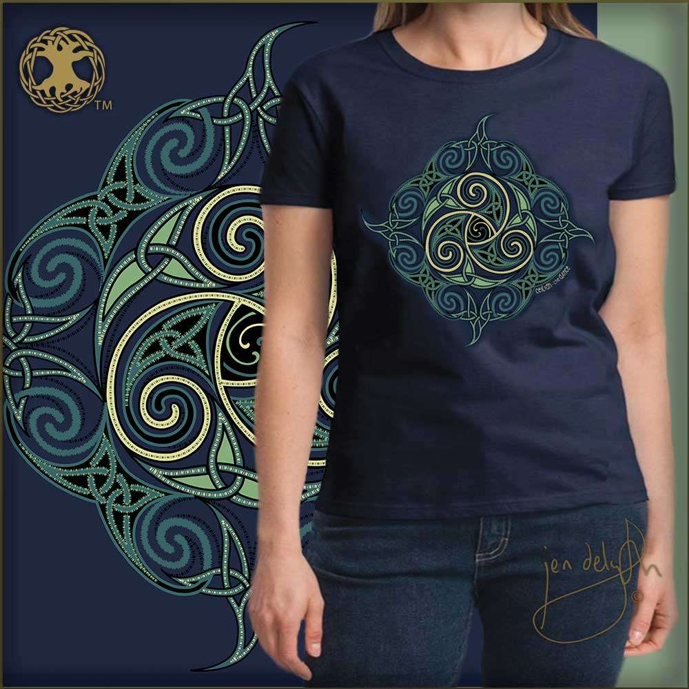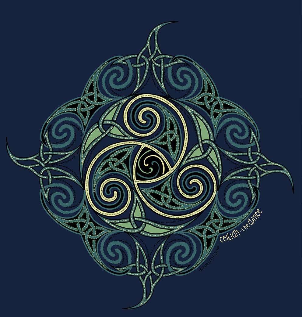 Ladies 100% pre shrunk Cotton Scoop Neck Cap Sleeve Tee Shirt in Navy Blue. Within Celtic tradition the Ceilidh is a gathering, a celebration of music, storytelling and dance. The long winter nights are passed to the music of the fiddle, whistle, the beat of the bodhran drum. The traditional Celtic dances weave intricate patterns of circles, spirals, squares in arrangements of threes and fours – a dynamic expression of the eternal knot.