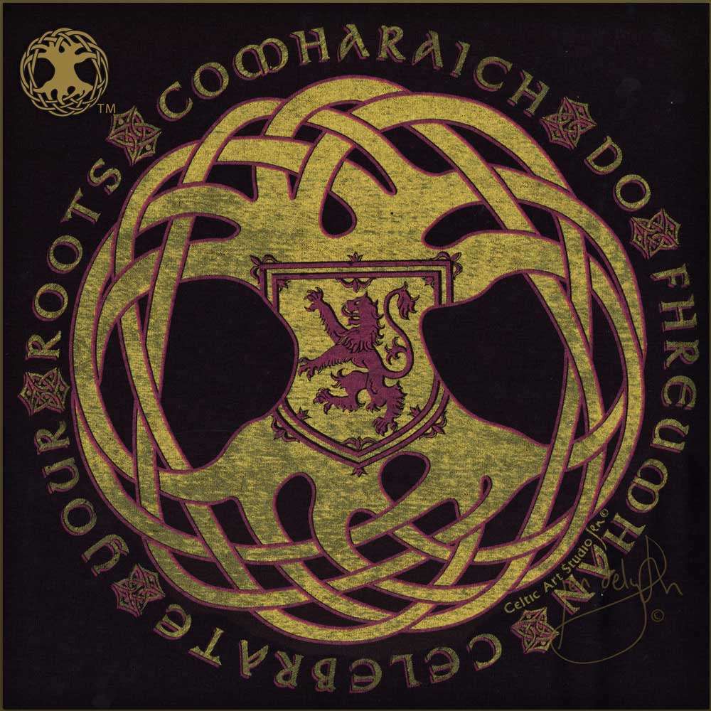 Short Sleeve 100% Pre Shrunk Cotton Tee Shirt for Men and Women in Black. Scottish Heritage – Celebrate Your Roots is here written in Scottish Gaelic, and English, entwined around iconic Celtic Tree of Life artwork. The Montrose Shield and Lyon Rampant was chosen to represent Scotland and her people at the heart of the Tree of Life…