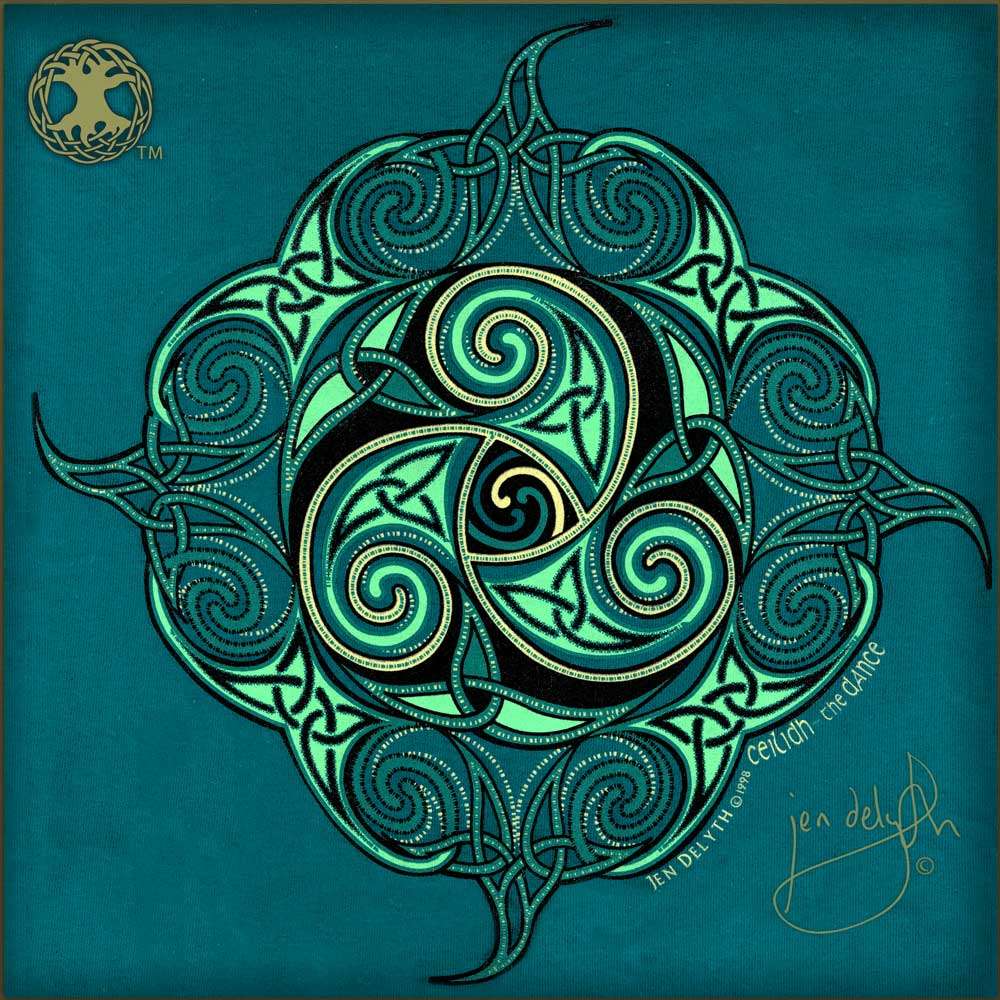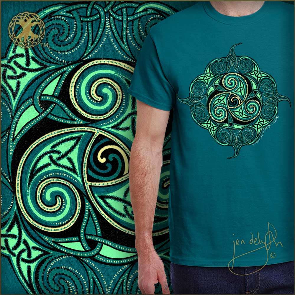 Short Sleeve 100% pre shrunk cotton Tee Shirt in a Galapagos Blue color for Men or Women. Within Celtic tradition the Ceilidh is a gathering, a celebration of music, storytelling and dance. The long winter nights are passed to the music of the fiddle, whistle, the beat of the bodhran drum. Beautiful Celtic swirls and knots embellish this design.