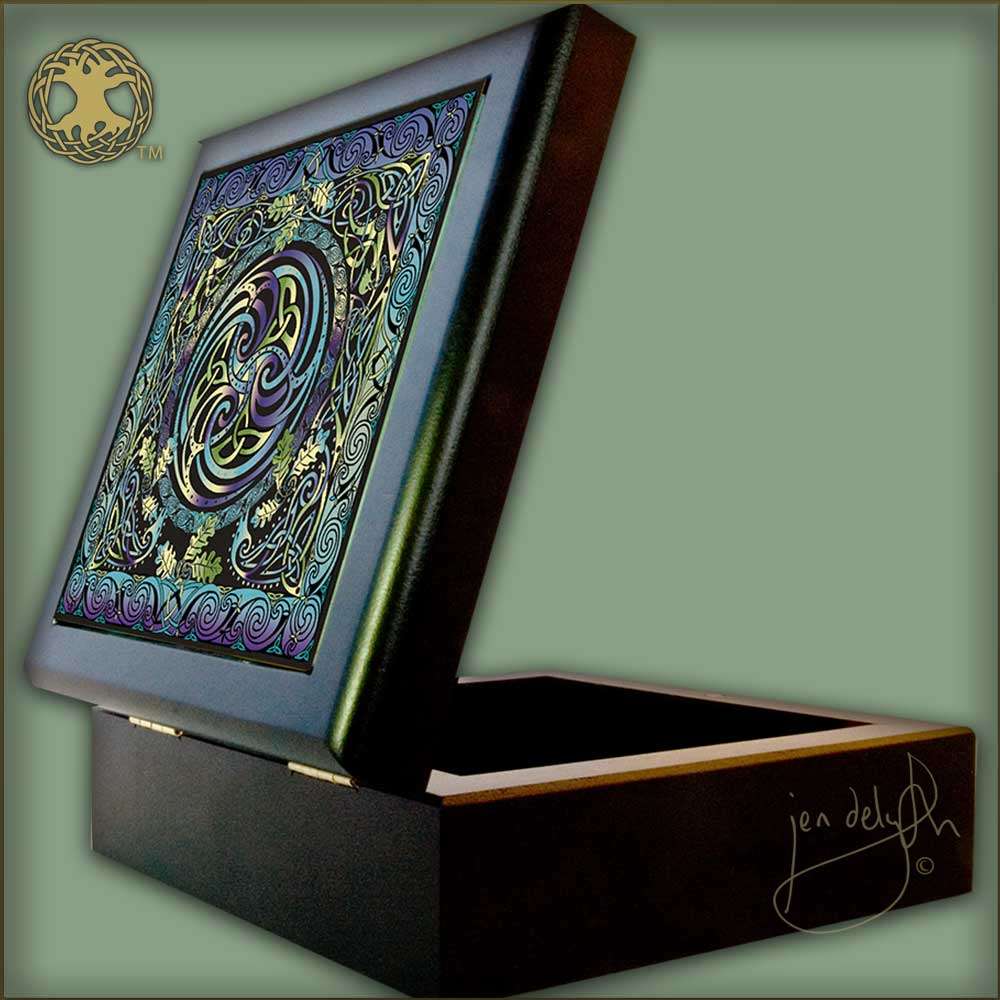 These charming crafted wooden keepsake boxes with inlaid ceramic tiles feature original artwork by Welsh Artist, Jen Delyth. Triskele – the Celtic triple spiral patterns flow into the center, and out again, a spiral dance of life. Triple spiral designs are amongst the most ancient symbols created by our ancestors. The Aois Dana – the Weavers – are the inspired poets. They draw from the well of wisdom and knowledge, and drink from the waters of life – represented here by the triple spiral border design.