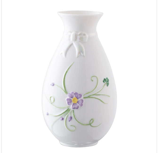 New in 2025, The Ribbon Spill Vase features a delicate lilac flower, blossoms, swirling vines and Belleek iconic hand painted shamrock. Finished off with a cute embossed bow that has been highlighted with a mother of pearl lustre this perfect for a small flower arrangement. Measures 3.5"W x 6"H.  Handcrafted in Ireland