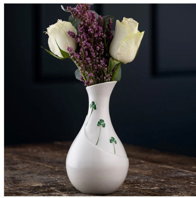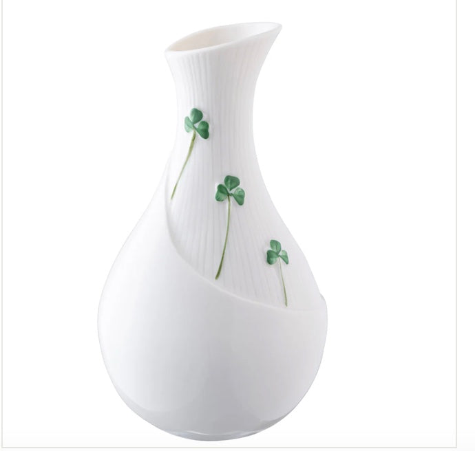 New! This Shamrock Meadow Vase features a contemporary shape adorned with Belleek’s iconic hand painted shamrocks.  The delicately embossed section of the vase features a linear pattern inspired by sprouting shamrocks and is contrasted with the smooth base to create a timeless piece.  Measures 3.8"W x 6"H.  Handcrafted in Ireland