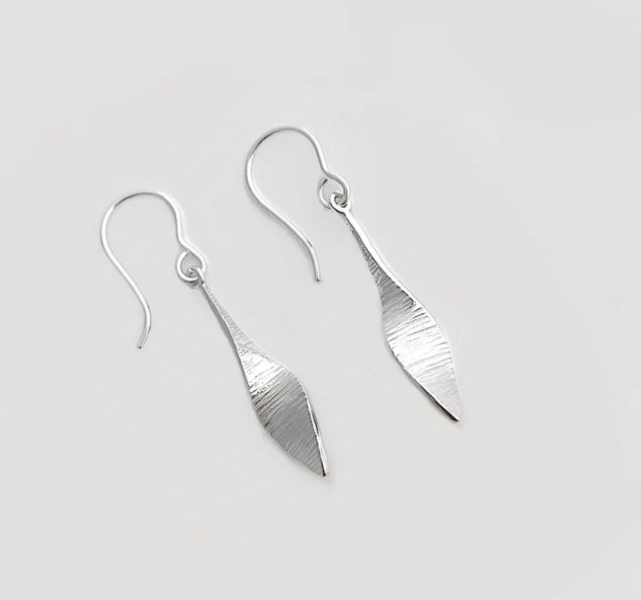 This is an Irish design award-winning handcrafted sterling silver earrings. The Bean Ri (She King) Collection. Stunning, candle flame like; a celebration of elegance, and femininity, of passion and strength. The Bean Rí Collection is a striking tribute to the powerful yet often untold role of women in Irish history. Created in collaboration with the National Museum of Ireland to mark the 1000th anniversary of the Battle of Clontarf, this collection symbolises the fierce elegance and strength of Ireland’s warrior queens, celebrated in both myth and history. The design of the Bean Rí, meaning "Woman King" in Irish, draws inspiration from Bronze Age spearheads in the museum’s collection, reimagined with a graceful quarter twist and textured surface This medium pair earring measures 1 1/4"" plus the sterling silver fish hook style wire.