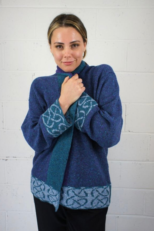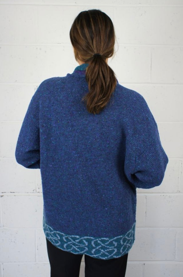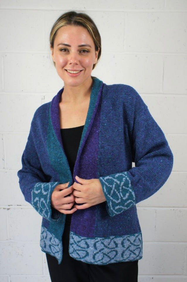 Knitted in wonderfully soft 100% merino wool, the Skye Jacket is a superb addition to your wardrobe. The yarn is spun in Donegal Ireland and carries a rich scatter of color fleck throughout each of the main color used.   The yarn is from Ireland and blendedwith colorways in Edinburgh, Scotland giving the Skye Jacket a truly Celtic heart. Easy to wear, this is a loose fitting style with reversible cuffs which allow you to fold back and shorten the sleeves. There are no buttons or fastening so simply wear it open or if you should like, you can pair with a brooch pin to the fasten the jacket.