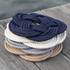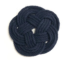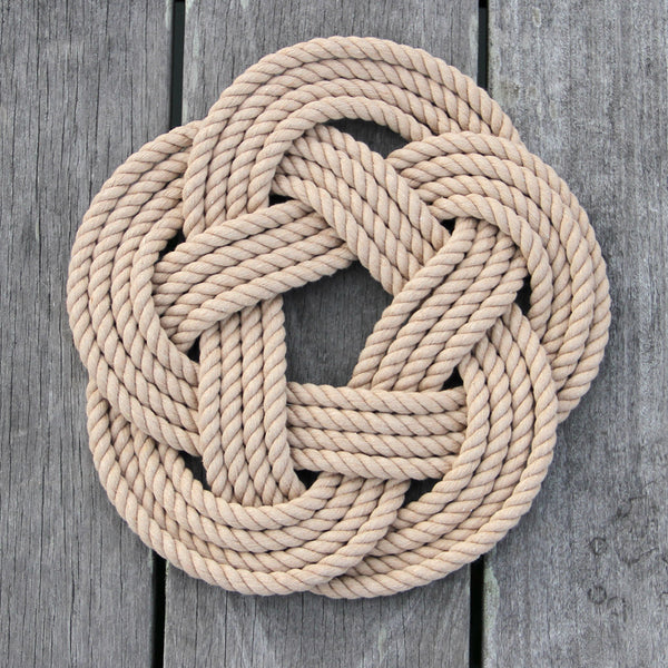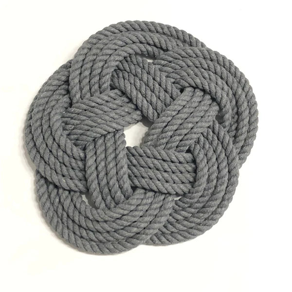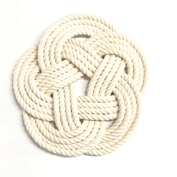 Celtic Nautical Knot trivets are the finishing touch. This is 11 inches in diameter, and is perfectly sized for your pie plates, serving dishes, or even under a table plant. The classic look matches the classic coastal or even rustic styles.   These are all cotton and is safe to 400 degrees and a simple spot cleaning with a mild detergent is all it takes to keep them clean.