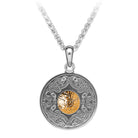 Crafted from Sterling Silver and 18Kt yellow gold center bead that  blends traditional craftsmanship with symbolic strength.  The warrior collection is inspired and designed from the Ardagh chalice.  The Ardagh Chalice from the 8th century is Ireland’s most prized artefact and is held in the National Museum of Ireland.  Based on the panels of this chalice the Warrior Collection was born.  The perfect gift for the warrior in you!  This is the medium disk that measures about 1" and comes on a 18" sterling silver chain.  Made in Ireland.