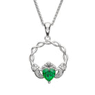 This Sterling Silver Claddagh pendant features an elegant twisted design and showcases a striking faceted green CZ heart stone and trinity knots. A beautiful addition to our matching ring. Comes on an 18" sterling silver chain. Made in Ireland.