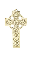 Crafted from durable brass, this Celtic wall cross features intricate knotwork designs that embody timeless Celtic traditions. Its sturdy construction ensures lasting beauty, making it an elegant accent for any space seeking a blend of spiritual symbolism and classic craftsmanship. Ideal for those who appreciate detailed artistry and cultural heritage. Measures  5'' x 2.5''.  Made in Ireland.