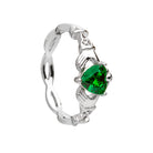 A beautiful Sterling Silver Claddagh Ring with Trinity Knot accents on an open weave band with a heart shaped faceted green CZ stone. The Claddagh represents Love (Heart), Loyalty (Crown) and Friendship (Hands). Handcrafted in Ireland.