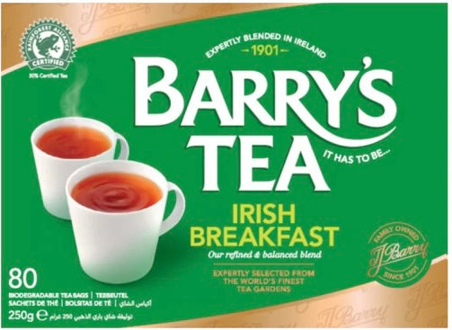 Blended for the Irish Palate, Barry's Irish Breakfast Tea has a brisk refreshing taste and a bright golden color. Barry's selected this blend from the Assam Valley of India and the gardens of Rwanda and Kenya, but it's the bright freshness of the African leaves that make this tea so refreshing. It’s the perfect blend to enjoy anytime of the day. 80 Count tea bags. Blended in Cork, Ireland
