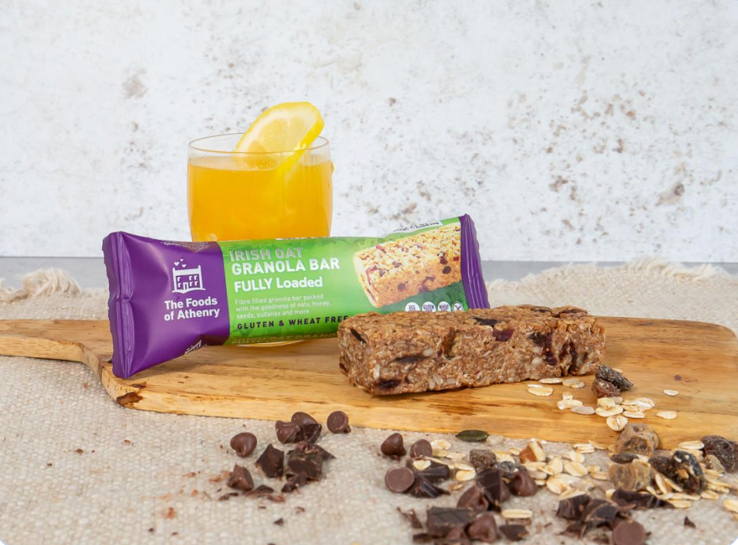 From Ireland, Energy-Packed Granola Bar. A high-energy pure oat granola bar made with butter, dried fruits, chocolate chips, seeds, and coconut. Fibre-filled and bursting with wholesome goodness — fuel your day with every delicious gluten free bake! Made in Galway, Ireland.