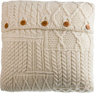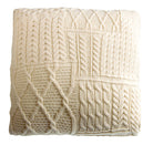 Beautiful Aran pillow cover with buttons. Featuring traditional Aran stitch patterns, patchwork style, including diamond stitch, mirrored and regular rope cables, elongated cables, and honeycomb stitch. A perfect engagement, wedding, or housewarming gift idea, to be treasured for years. The Aran stitch patterns feature on both the front and back of the pillow cover. Knitted in premium 5 gauge 100% Merino in Ireland. Dimensions: 16in x 16in (41cm x 41cm).
