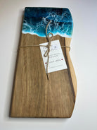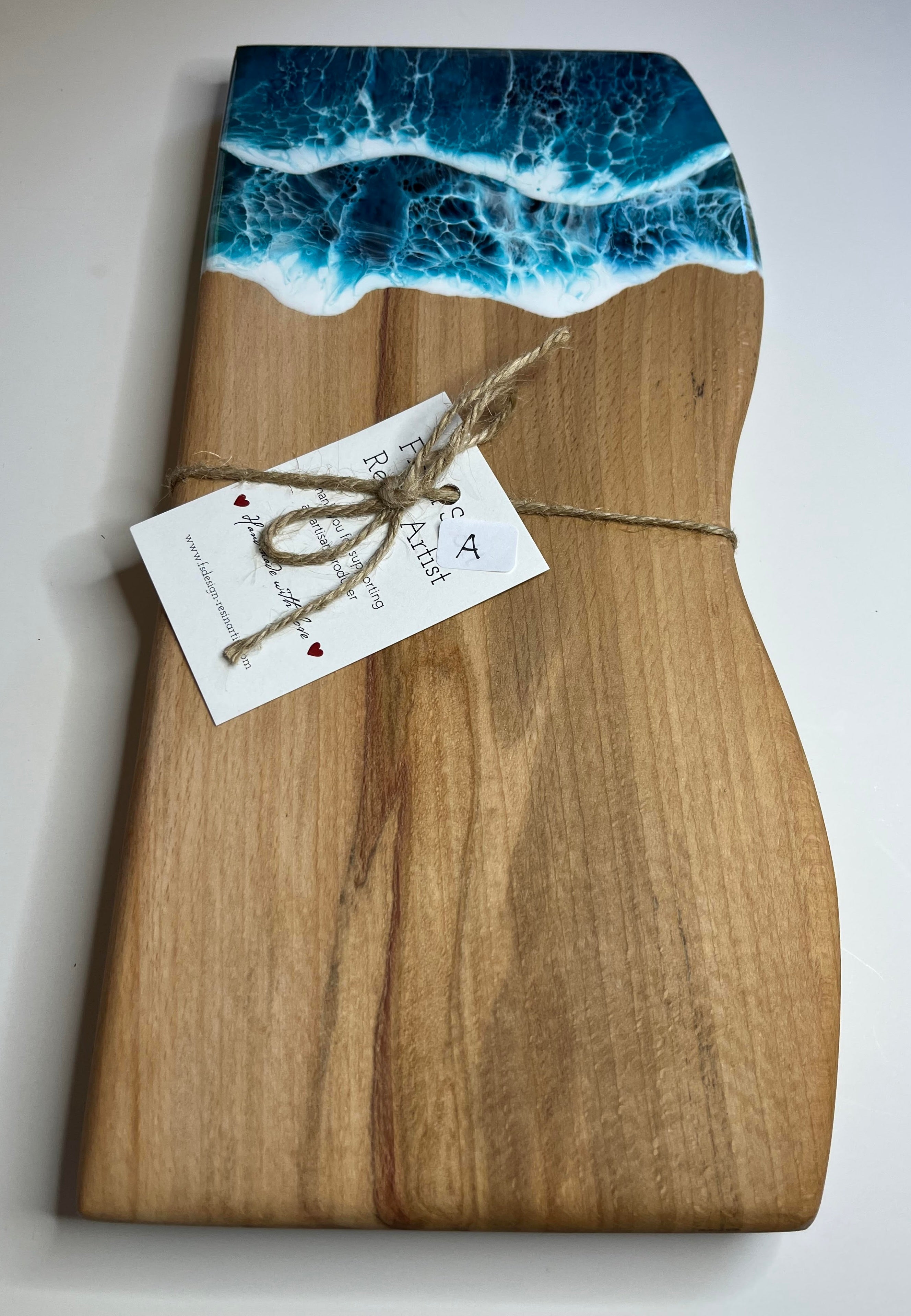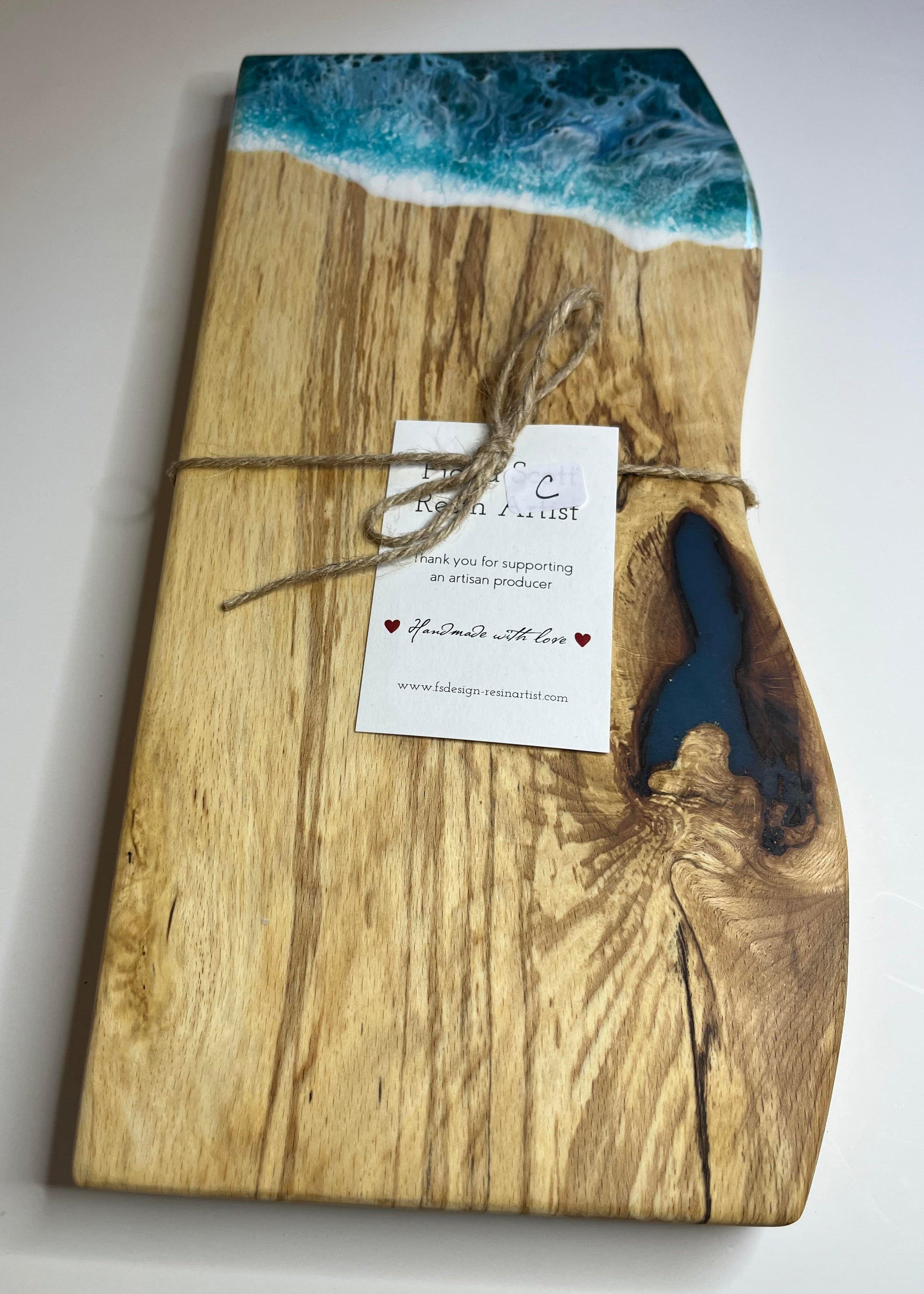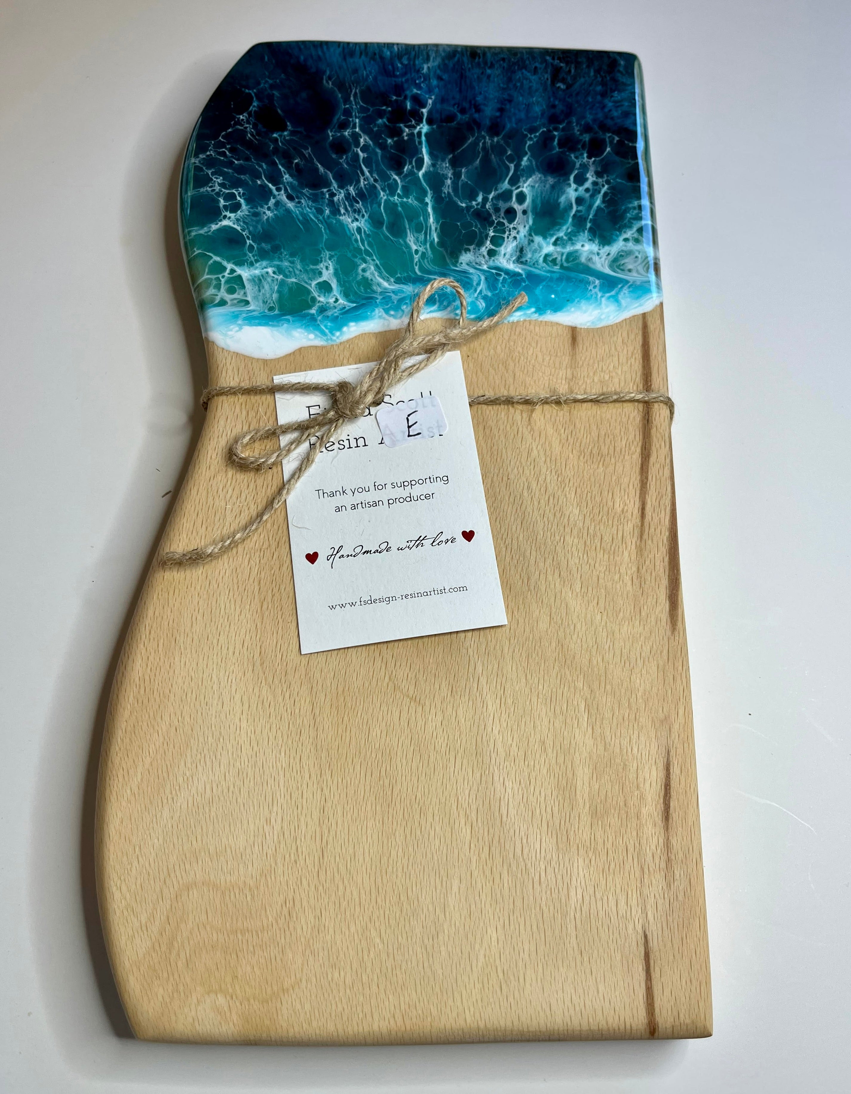 Handcrafted from solid Irish beech, this beautiful wood really makes the Ocean inspired resin flow art pop. Using marine blue, turquoise and white, this cheese board with resin art poured down one end with single wave or double wave., inspired by walks along the beach and Inspired by the sometimes stormy seas off the coast of West Cork.